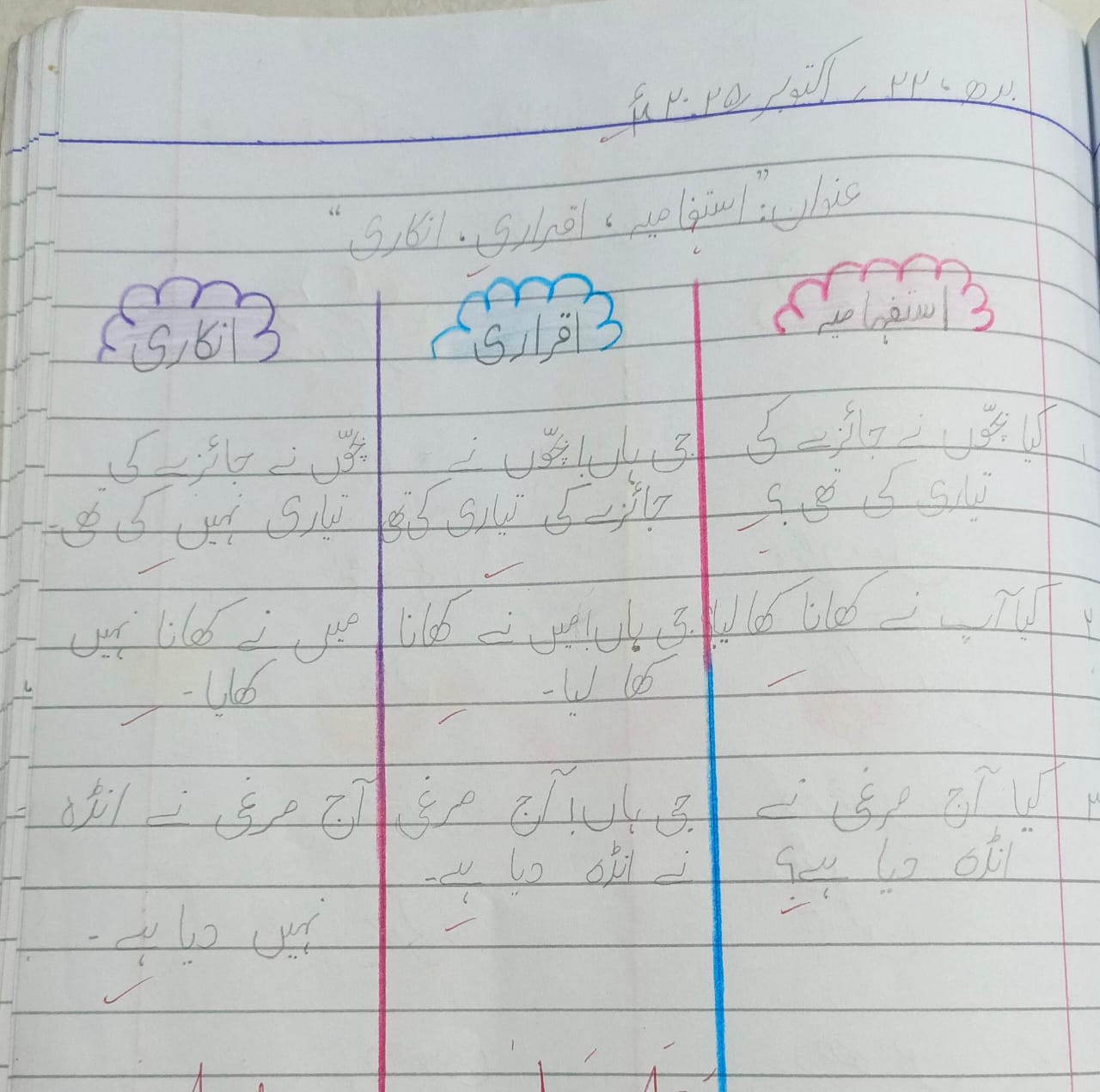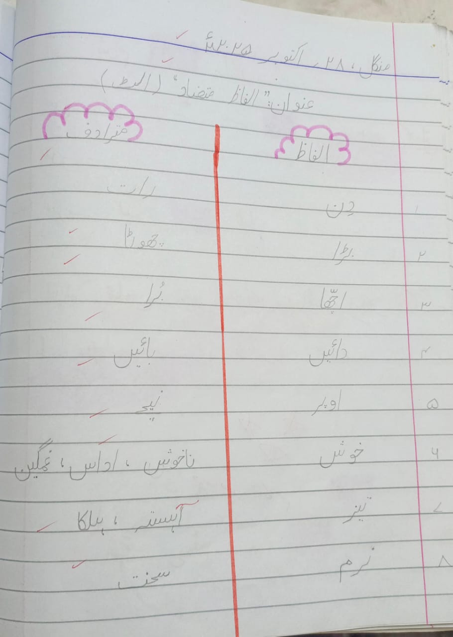 Homework:* Revision Lessons:- 1. Computer k faeday 2. Acha Shehri 3. Sohni Dharti Word meaning and Markazi khayal test will be on Friday..