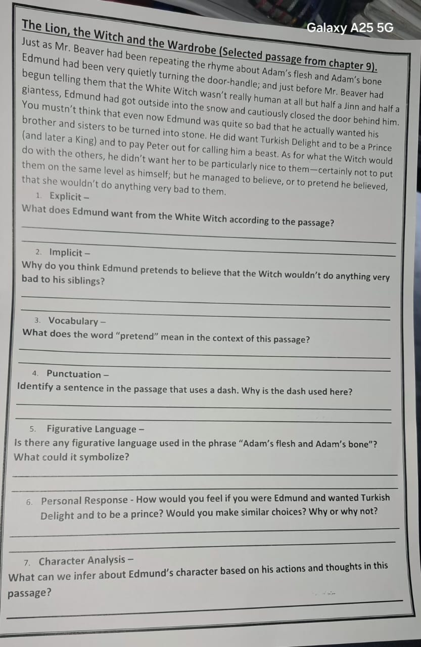 Grade5 Mars:English Read pages 14 to 16 from the novel:The lion ,the witch and the wardrobe for quiz..