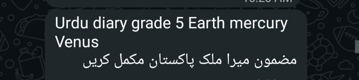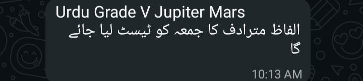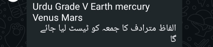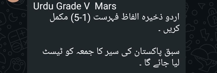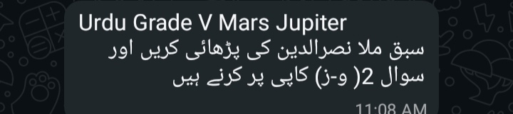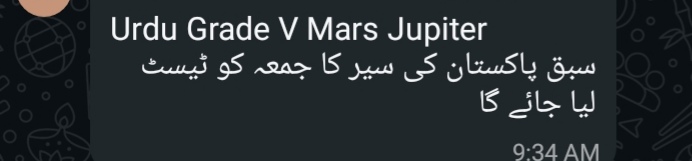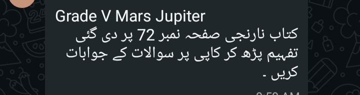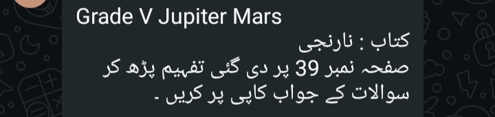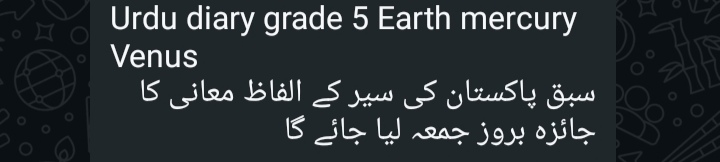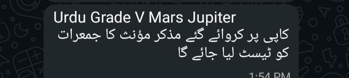 Islamiyat (all) *5 Venus 5 Mars* Reminder Chapter 5 belief in the hereafter and obedience to Prophet test tomorrow Also complete all previous work *5 Jupiter 5 Earth* Test on Thursday Chapter 5 Belief in the hereafter and Obedience to Holy Prophet Also complete previous work copies will be checked tomorrow .