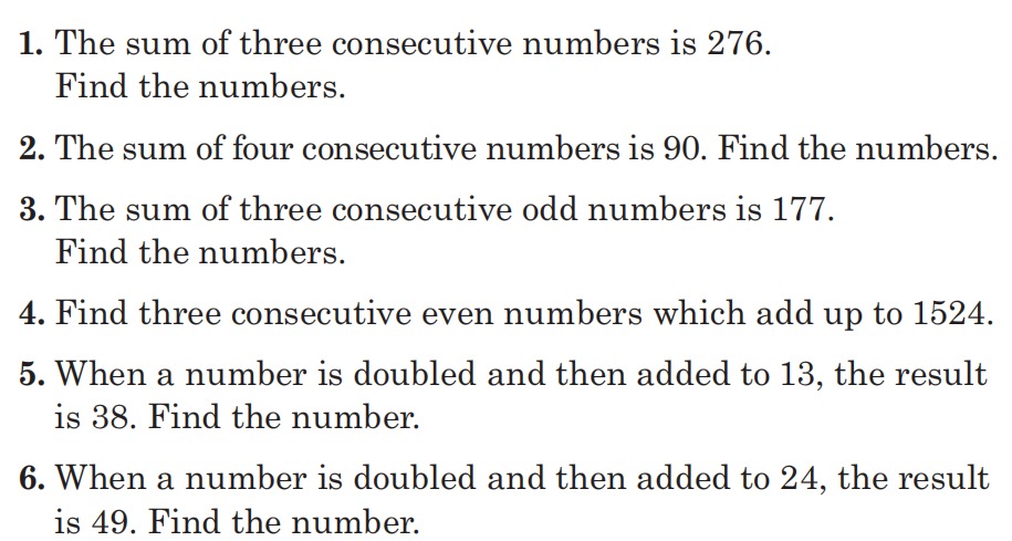 Solve the following questions in the notebooks. Q1) A number subtracted from 9 is equal to 2 times the number. Find the number. Q2) Multiply an unknown number by five is equal to adding twelve to the unknown number. Find the number. Q3) A farmer cuts a fence into two pieces of different sizes. The longer piece should be four times as long as the shorter piece. The total length of the fence is 300 foot. How long are the two pieces? Q4) The sum of three consecutive numbers is 78. Find the numbers..