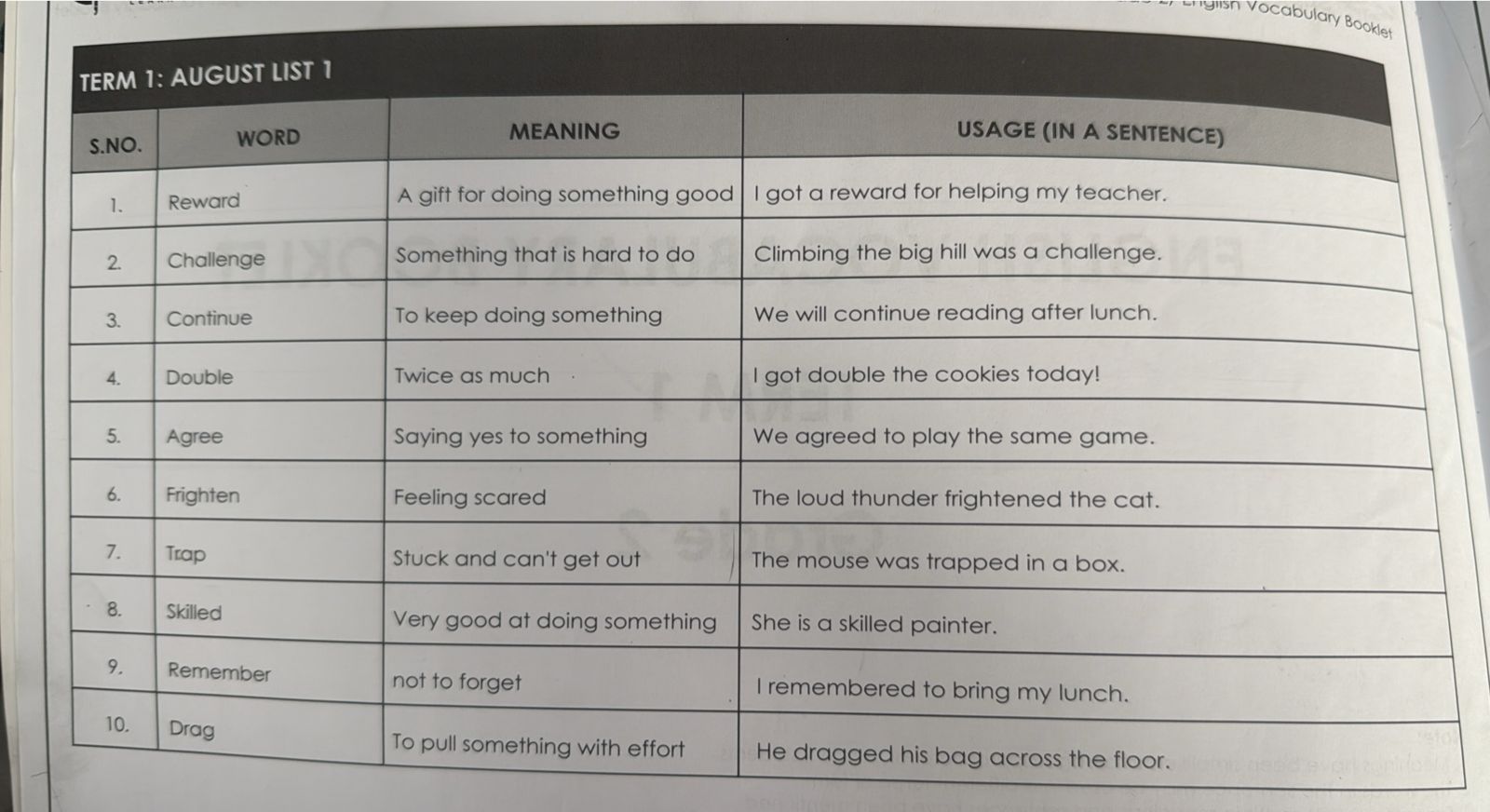 Make noun phrases given in notebook 2. Learn Meanings of first five words from Vocabulary booklet August list 1..
