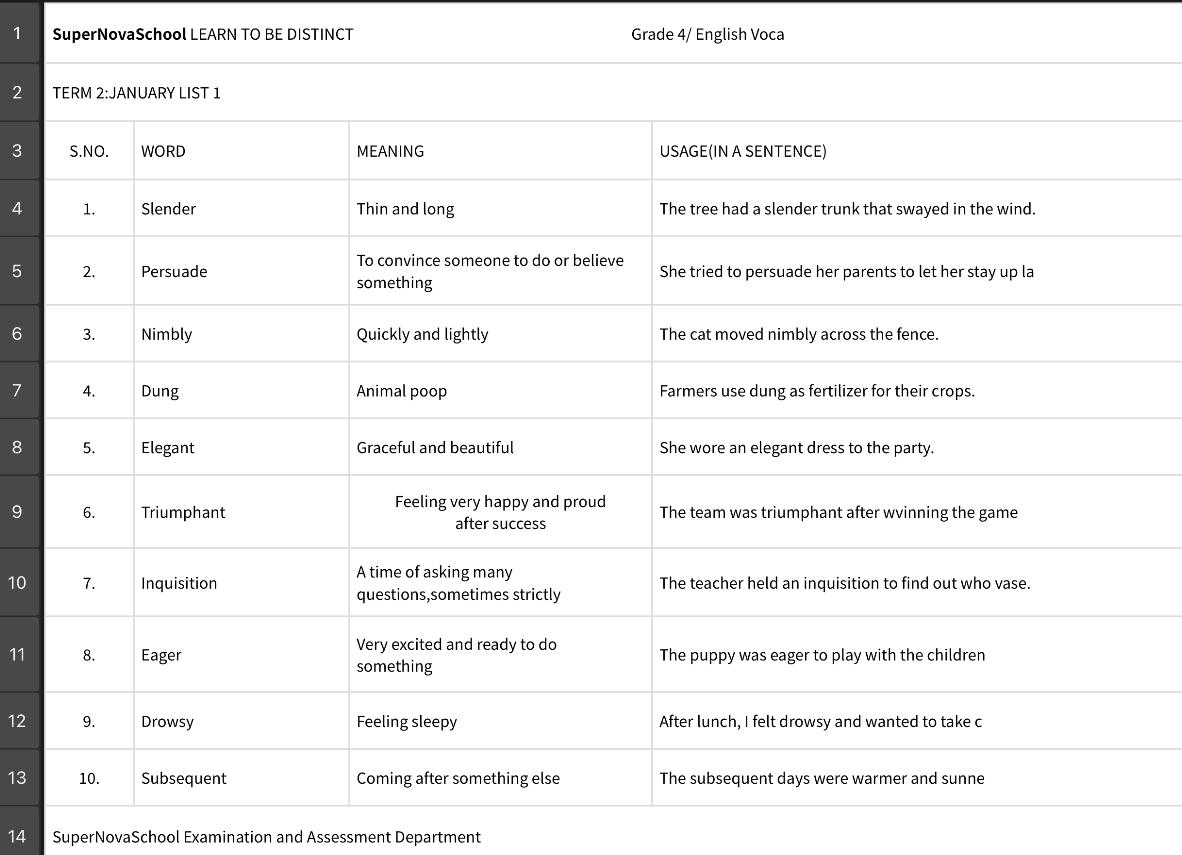 *ENGLISH H.W grade 4 Mercury and 4 Venus* Dear students, kindly prepare first five words of vocabulary January List.1 (spellings, meanings, useage in sentences).