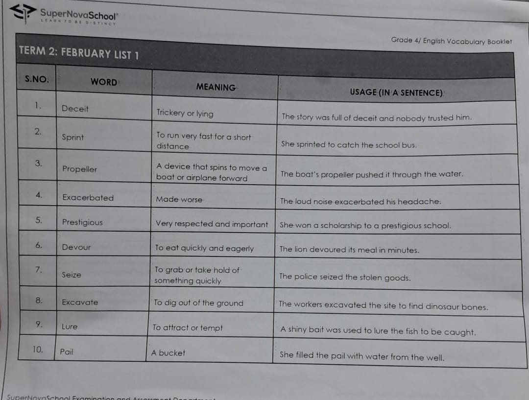 *Honework English : 4 Mercury 4 Venus :* Revise all words of Vocabulary booklet January List.2 along with their meanings and spellings. Practice usage in their own sentences in rough notebooks..