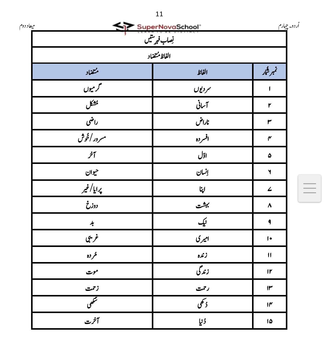 Urdu Grade 4 Homework: Muzakkar Muannas aur Alfaz Mutzad ka Jaeza Jumay ko hoga Reminder: Sabaq "Qudrati Aafat" Ka complete jaeza Kal hoga.