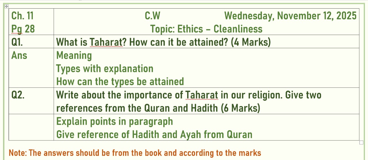 Islamiat Grade VI Jupiter Written test of topics Hajj and Prayers, will be taken on Wednesday..