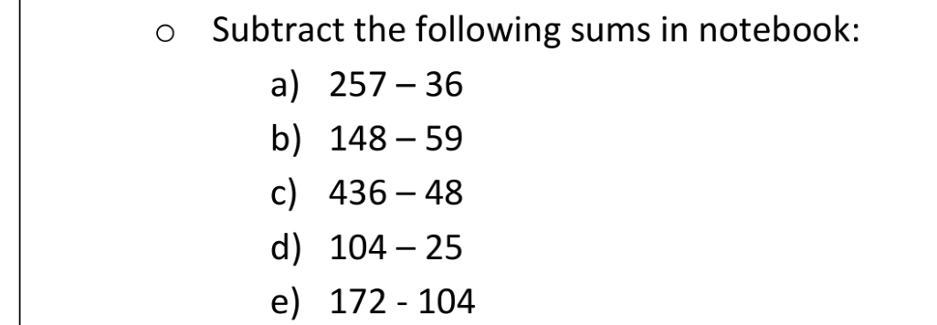 Subtract the following sums in homework notebook: a) 257 – 36 b) 148 – 59 c) 436 – 48 d) 104 – 25 e) 172 - 104.