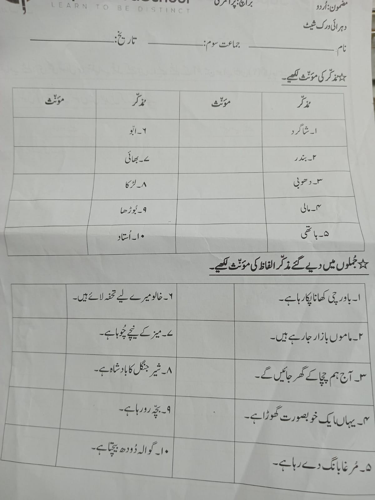 Homework Urdu grammar. Do muzkar muanas given on Duhrae worksheet. .