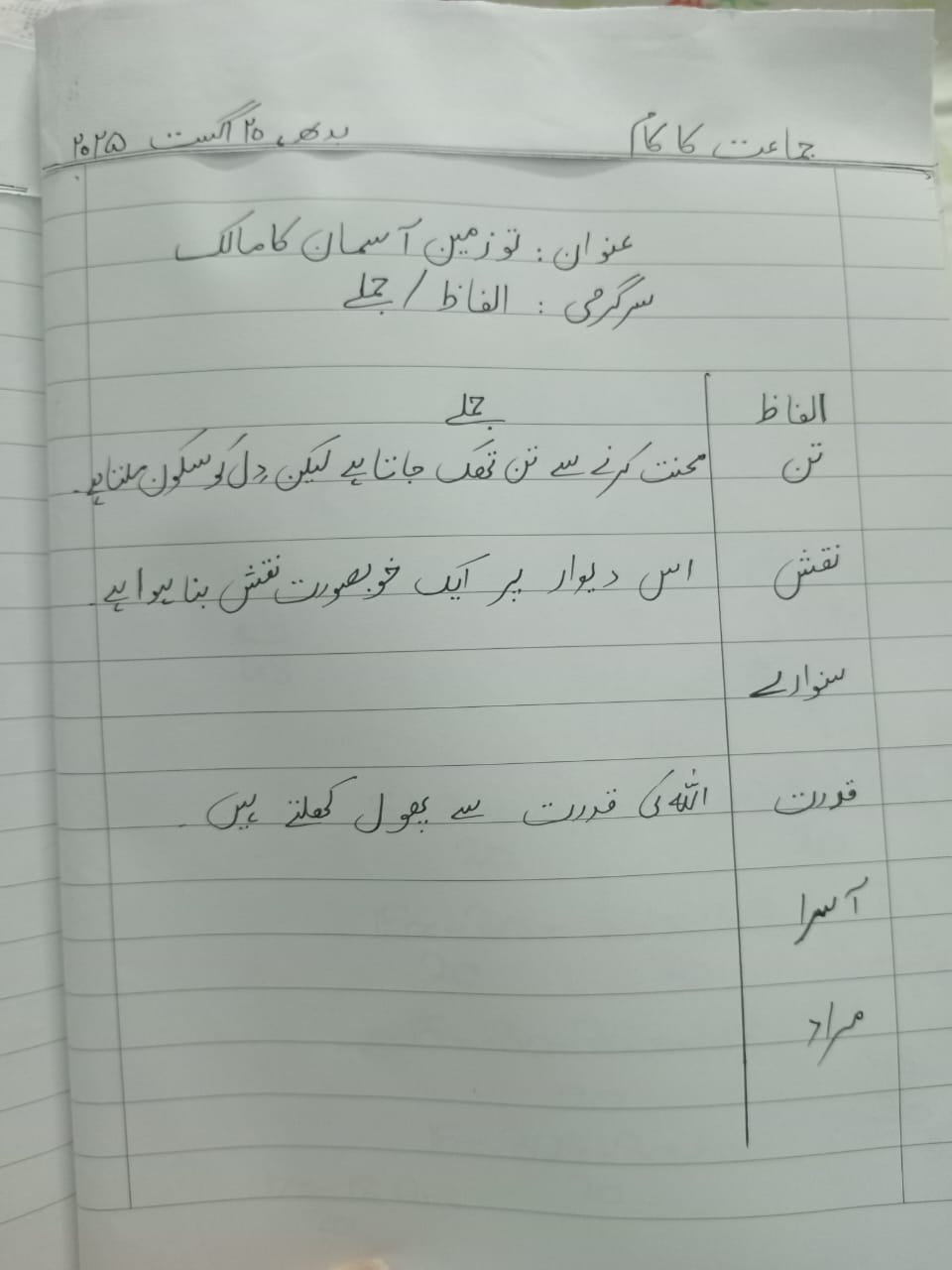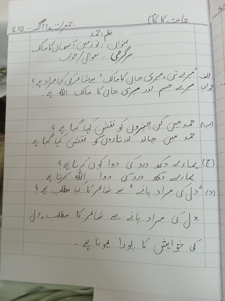 Class work.Haroof-e-jar ki tareef aur misalain jamaat mai karwaen gain. Home work: Nazam Hamad kay ilfaaz jumlay ka test Monday ko ho ga..